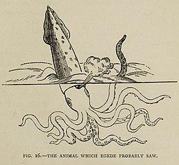 10. ^ The giant squid has long been mooted as a possible explanation for "sea monster" sightings (Gould, 1886; Gibson, 1887; Ellis, 1994a), including, most famously, the kraken (Lee, 1875, 1883; Buel, 1887:81; Bullen, 1898:139; Allan, 1955a, b; Heuvelmans, 1958; Garcin & Raynal, 2011; Salvador & Tomotani, 2014; Walker, 2016; Naish, 2017), but also various "sea serpents" (Oudemans, 1892; Ellis, 1994b), such as the one purportedly seen off Greenland in 1734 and later reported by Hans Egede (Lee, 1883:64; Ellis, 1998a:15; but see Paxton et al., 2005), that spotted by the crew of HMS Daedalus in 1848 (Lee, 1883:79; Ellis, 1998a:20; Switek, 2011; but see Galbreath, 2015:42), that encountered by HMS Plumper later the same year (Carrington, 1957:35), that allegedly observed battling a whale from the barque Pauline in 1875 (Carrington, 1957:36), and even Scylla of Greek mythology (Ley, 1941). However, some authors have cautioned against attributing such sightings to giant squid (Paxton, 2003) and offered alternative explanations (France, 2016a, b, 2017).