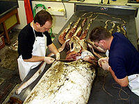 Giant squid found at Ranheim in Trondheimsfjord, Norway, on 2 October 1954 (#137), being examined by Professors Erling Sivertsen and Svein Haftorn. This specimen measured 9.24 m in total length and had a mantle length of 1.79 m.
