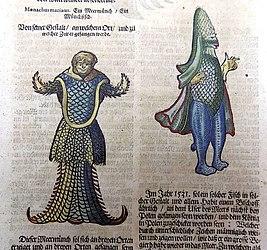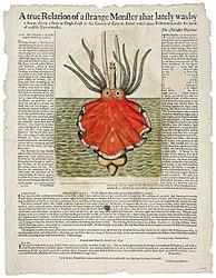 11. ^ Early sources variously give the date as 1545 (Vedel, 1575), 1546 (Hamer, 1546; Rondelet, 1554; Gessner, [1558]), December 1549 (Holberg, 1733), or 1550 (Huitfeldt, [1595]; Stephanius, [c. 1650]). Lycosthenes (1557) mentions three "sea monks" supposedly found in 1530, 1546, and 1549, the first in the Rhine and the latter two near Copenhagen (possibly referring to the same specimen). The earliest known source, a German woodcut of the creature dating from 1546 (Hamer, 1546)—according to which the event happened the same year—places an upper bound on the date, and Paxton & Holland (2005) consider 1546 to be the most likely year.