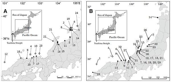 Locations of the 57 giant squid specimens encountered in the Sea of Japan between January 2014 and March 2015, in what remains the largest mass appearance of this species ever recorded, from Kubodera et al. (2016). The two maps show specimens (numbered chronologically) from the two main stranding events in January–May 2014 (A; spanning #518 to 543) and September 2014–March 2015 (B; spanning #544 to 577).