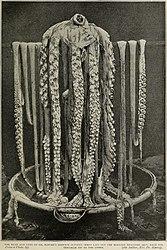 The earliest known photograph of an intact giant squid, showing the arms, tentacles and buccal region of the head (including beak) of a specimen from Logy Bay, Newfoundland (#30 on this list), draped over Reverend Moses Harvey's sponge bath, November or December 1873. Harvey wrote in his journal: "I knew that I had in my possession what all the savants in the world did not […] what the museums in the world did not contain […] A photograph could not lie and would silence the gainsayers" (Frank, 2014:246; Offord, 2016). The photograph includes contemporaneous annotations by zoologist Addison Emery Verrill, including a 1-foot scale bar (top left) and detailed marginal notes.[nb 1]