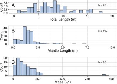 Frequency distribution of total length, mantle length, and mass in Architeuthis dux, from McClain et al. (2015). The 2,000 lb (910 kg) extreme outlier (#22) is from an estimate mentioned in Verrill (1880a:181) and is unlikely to be accurate; the next most massive individual in the data set was only 700 lb (320 kg) and 95% of specimens were below 250 kg (550 lb). Similarly, 95% of individuals had recorded mantle lengths below 3.26 m (10.7 ft) and total lengths below 15.26 m (50.1 ft) (McClain et al., 2015:Table 3).