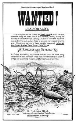 Preserved giant squid specimens are much sought after for both study and display (Landman & Ellis, 1998; Ablett, 2012). In the mid-1960s, marine biologist and giant squid expert Frederick Aldrich of the Memorial University of Newfoundland organised a "squid squad" with the intent of securing specimens for study. In the 1980s, Aldrich resorted to distributing eye-catching "Wanted" posters offering rewards for "finding and holding" specimens stranded on the Newfoundland coast, "the value being dependent on their condition" ([Anonymous], 1988:4, 1989:7; Ellis, 1998a:46; Lien, 2000:278; Grann, 2004). Aldrich (1991:459) wrote that "[s]uch efforts were not futile, for in the intervening years I have secured either the specimens or information on 15 animals", though according to Hoff (2003:85) the rewards went unclaimed.