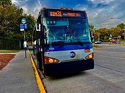 A SIM31 express bus terminates at the Eltingville Transit Center in Eltingville, Staten Island.