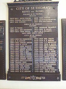 This is a list of reeves and mayors of St. Thomas, Ontario, Canada. St. Thomas was incorporated as a village in 1852, as a town in 1861, and as a city in 1881.