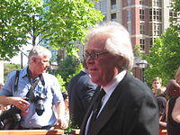 For a person to be inducted to the Hockey Hall of Fame, they must be nominated by an elected 18-person selection committee which consists of Hockey Hall of Fame members and media personalities. Each committee member is allowed to nominate one person in each category per year, and candidates must receive the support of 75% of the members of the committee that are present, or a minimum of ten votes. In any given year, there can be a maximum of four male players, two female players, and a combined two in the builders and on-ice officials categories. For a player, referee, or linesman to be nominated, the person must have been retired for a minimum three years. Builders may be "active or inactive".[3] The induction ceremony is held at the current Hall of Fame building[2] and was first broadcast by The Sports Network in 1994.[4]