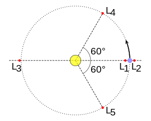 L5 is the Sun–Earth Lagrange point located close to the Earth's orbit 60° behind Earth.