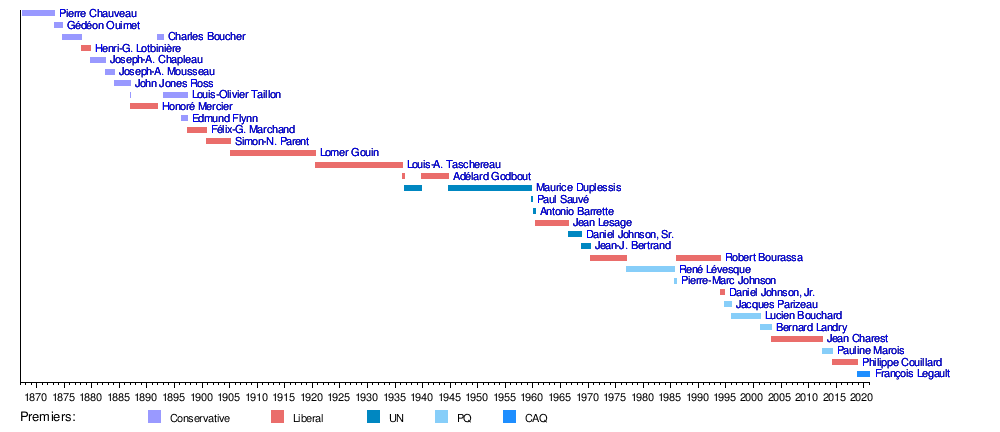 This article only covers the time since the Canadian Confederation was created in 1867. For the premiers of the Canada East from 1840 to 1867, see List of Joint Premiers of the Province of Canada. The governments of Lower Canada from 1792 to 1840 were mostly controlled by representatives of the Crown.