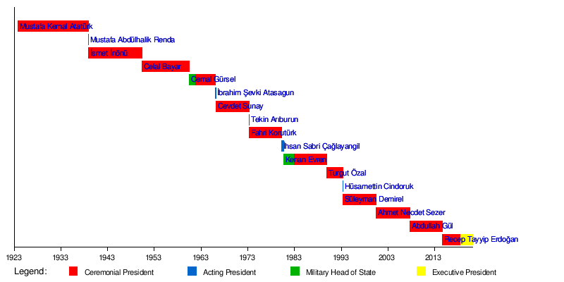 | 12 | Recep Tayyip Erdoğan (born 1954) | 28 August 2014 | 9 July 2018 | Justice and Development Party | 25th Prime Minister of Turkey | 20 | 2014 | ||