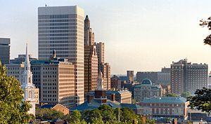 Providence, the capital of the U.S. state of Rhode Island and the third-largest city in New England, is home to 34 high-rises,[1] twenty of which stand at least 175 feet (53 m) in height. The tallest skyscraper in the city is the Industrial National Bank Building at 111 Westminster Street, which rises 26 floors and 428 feet (130 m) in Downtown Providence.[2] The Industrial National Bank Building, nicknamed the "Superman Building" due to its resemblance to the fictional Daily Planet building from the 1950s TV series, Adventures of Superman,[2] is also the tallest building in Rhode Island and the sixth-tallest building in New England outside of Boston.[3] The second-tallest building in Providence is One Financial Plaza, which rises 30 floors and 410 feet (125 m) and was completed in 1973.[4]