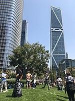 This surge of construction was dubbed "Manhattanization" by opponents and led to local legislation that set some of the strictest building height limits and regulations in the country.[12] In 1985, San Francisco adopted the Downtown Plan, which slowed development in the Financial District north of Market Street and directed it to the area South of Market around the Transbay Terminal.[13] Over 250 historic buildings were protected from development and developers were required to set aside open space for new projects.[14] To prevent excessive growth and smooth the boom-and-bust building cycle, the Plan included an annual limit of 950,000 square feet (88,000 m2) for new office development, although it grandfathered millions of square feet of proposals already in the development pipeline. In response, voters approved Proposition M in November 1986 that reduced the annual limit to 475,000 square feet (44,100 m2) until the grandfathered square footage was accounted for, which occurred in 1999.[15][16]