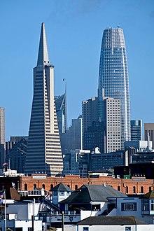 San Francisco, California, in the United States, has at least 472 high-rises,[1] 56 of which are at least 400 feet (122 m) tall. The tallest building is Salesforce Tower, which rises 1,070 ft (330 m) and as of September 2018 is the 13th-tallest building in the United States.[2] The city's second-tallest building is the Transamerica Pyramid, which rises 853 ft (260 m), and was previously the city's tallest for 45 years, from 1972 to 2017.[3] The city's third-tallest building is 181 Fremont, rising to 802 ft (244 m).