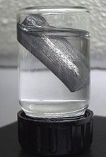 Lithium has a very low density (0.534 g/cm3), comparable with pine wood.[8] It is the least dense of all elements that are solids at room temperature; the next lightest solid element (potassium, at 0.862 g/cm3) is more than 60% denser. Furthermore, apart from helium and hydrogen, as a solid it is less dense than any other element as a liquid, being only two-thirds as dense as liquid nitrogen (0.808 g/cm3).[9] Lithium can float on the lightest hydrocarbon oils and is one of only three metals that can float on water, the other two being sodium and potassium.