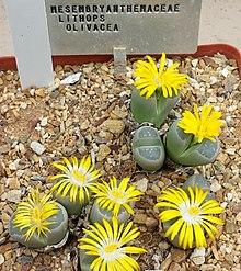Lithops is a genus of succulent plants in the ice plant family, Aizoaceae. Members of the genus are native to southern Africa. The name is derived from the Ancient Greek words λίθος (líthos), meaning "stone," and ὄψ (óps), meaning "face," referring to the stone-like appearance of the plants. They avoid being eaten by blending in with surrounding rocks and are often known as pebble plants or living stones. The formation of the name from the Ancient Greek "-ops" means that even a single plant is called a Lithops.