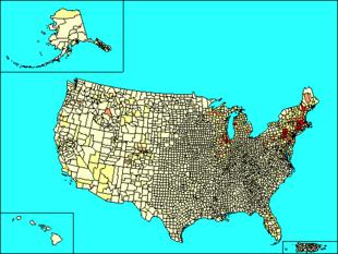 Chicago has the largest Lithuanian community in the United States and with approximately 100,000 self-identified ethnic Lithuanians has the largest population of Lithuanians of any municipality outside Lithuania itself.[10] The old "Lithuanian Downtown" in Bridgeport was once the center of Lithuanian political activity for the whole United States. Another large Lithuanian community[11] can be found in the Coal Region of northeastern Pennsylvania, particularly in Schuylkill County where the small borough of New Philadelphia has the largest per capita percentage of Lithuanian Americans (20.8%) in the United States. There is also a large community of Lithuanian descent in the coal mining regions of Western Pennsylvania, northern West Virginia Panhandle and Northeastern Ohio tri-state area. Grand County, Colorado's Lithuanian-American community has the unusual distinction in that it is the only sizable immigrant population in an otherwise fairly homogeneous population in a rural, mountainous community. There is also a small but vibrant Lithuanian community in Presque Isle, Maine. Many Lithuanian refugees settled in Southern California after World War II; they constitute a community in Los Angeles.[12] The majority of the Lithuanian community resides around the St. Casimir Lithuanian church in Los Feliz, in so-called "Little Lithuania.[13]