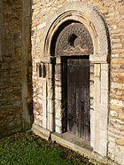 The earliest parts of the building are some Anglo-Saxon "long-and-short" stonework, visible externally at the southeast and southwest corners (quoins) of the nave. The church also has several Romanesque details dating from the Norman era, including a Priest's Door ("uncommonly ornate", according to Nikolaus Pevsner) with a finely carved tympanum; the empty circular niche in the tympanum is said to have held a relic; the birds in roundels to either side are probably eagles, as one is legendarily supposed to have sheltered Medard from the rain [1]. Also Norman are the plain, undecorated arch into the tower, and the north door (late 12th century).[5]