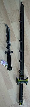 Some LARP rules call for the use of simulated weapons such as foam weapons or airsoft guns[52] to determine whether characters succeed in hitting one another in combat situations. In Russian LARP events, weapons made of hard plastic, metal or wood are used.[53] The alternative to using simulated weapons is to pause role-play and determine the outcome of an action symbolically, for example by rolling dice, playing rock paper scissors or comparing character attributes.[54]
