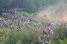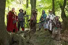 The participants in a LARP physically portray characters in a fictional setting, improvising their characters' speech and movements somewhat like actors in improvisational theatre.[4] This is distinct from tabletop role-playing games, where character actions are described verbally.[1] LARPs may be played in a public or private area and may last for hours or days.[5][6] There is usually no audience.[7] Players may dress as their character and carry appropriate equipment, and the environment is sometimes decorated to resemble the setting.[8] LARPs can be one-off events or a series of events in the same setting, and events can vary in size from a handful of players to several thousand.[9][10]