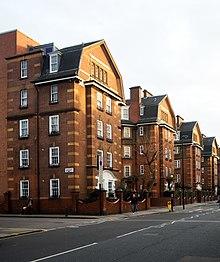 Samuel Lewis was a wealthy financier and philanthropist, who left an endowment of £670,000 for the purpose of establishing a charity to provide housing for the poor. The Samuel Lewis Trust was set up in 1901 and the Samuel Lewis Trust Dwellings at Liverpool Road was the first of eight London housing projects. The estate of 323 dwellings opened on 4 April 1910 and was built by Wallis and Sons Ltd at a cost of £101,000. The buildings were designed by C S Joseph and Smithem and consist of five rows of blocks with trees between them, including notable pollarded planes, and small island gardens set in paved areas. Nikolaus Pevsner described the estate as “the best illustration in Islington of the tremendous improvement in standards of planning and humane appearance that became apparent in the best working class housing around 1900”.[44] The units each had a coal bunker, and there was a bath underneath a wooden top in the kitchens.