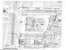 The architect for the new hospital was Charles Fowler, who received the commission due to the influence of the Earl of Devon. The circumstances caused some controversy: a competition had been held to choose a design, and one by David Mocatta had been formally decided upon by the committee, but it was set aside and Fowler was brought in to carry out the work.[27] Fowler designed the red-brick, colonnaded façade in Palladian style, with two wings. The front façade consisted of the front elevation with three blocks linked by single-storey colonnades very much as seen today. The central block and colonnades were intended to house offices, stores and the committee room. The Victorians used this design to disguise the wards of typhoid and scarlet fever patients, who were admitted from 1849. Behind were two flanking blocks which were occupied by 'superior class wards', incorporating the latest ideas of the time for healthy nursing.