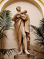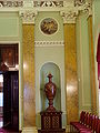In the centre of the ground floor is the Staircase Hall described in the Buildings of England series as "one of the great architectural spaces of Liverpool".[9] A broad staircase rises between two pairs of Corinthian columns to a half-landing, and narrower flights climb from that on each side to the upper floor. On the ground floor on each side of the staircase are display cabinets holding the city's silver. On the half-landing is a statue of George Canning dated 1832 by Francis Chantrey, and hanging on the wall above this is a portrait of Queen Elizabeth II by Sir Edward Halliday.[14]