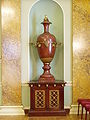 All the rooms on this floor are designed for entertainment and they have connecting doors that allow for a complete circuit of the floor. The middle room on the south side of the building is the Central Reception Room. It has a circular ceiling with pendentives, and plasterwork in neoclassical style designed by Francesco Bernasconi.[20] The room leads to the balcony overlooking Castle Street.[21] A door to the right leads to the West Reception Room, with a segmented-vaulted ceiling; it contains a marble chimneypiece with brass and cast iron fittings.[20] This room leads to the Dining Room which occupies the west side of the building. It has been described as "the most sumptuous room in the building".[20] Around the room are Corinthian pilasters. The plaster ceiling has moulded compartments and under these is a frieze decorated with scrolls, urns and crouching dogs. The roundels between the capitals of the pilasters contain paintings of pairs of cupids.[20][22]