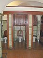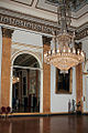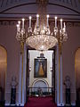 The next room on the circuit is a small room which leads into the Large Ballroom. This occupies the whole of Wyatt's north extension and measures 89 feet (27 m) by 42 feet (13 m); the ceiling is 40 feet (12 m) high. Around the room are Corinthian pilasters and on each of the shorter walls is a massive mirror. In the south wall is a niche for musicians, over which is a coffered semi-dome; on each side of this is a white marble chimneypiece.[23][24] Hanging from the ceiling are "three of the finest Georgian chandeliers in Europe";[24] each is 28 feet (9 m) high, contains 20,000 pieces of cut glass crystal, and weighs over one ton. They were made in Staffordshire in 1820. The floor is a maple sprung dance floor.[24] Most of the east side of the hall is occupied by the Small Ballroom, also known as the East Reception Room or Music Room. This room is surrounded by pilasters and at each end is a shallow apse; the apse in the north wall has two niches for musicians. Suspended from the ceiling are three 19th century chandeliers.[2][25] Completing the circuit is the East Reception Room, similar in style to the West Reception Room.[2] The rooms contain a number of portraits; one of these is of James Maury, America's first consul.[26]