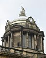 The town hall is built of stone with a slate roof and a lead dome.[1] Its plan consists of a rectangle with a portico extending to the south and Wyatt's rectangular extension to the north. The extension is slightly narrower than the rest of the building, and also has a projecting portico.[5] The building has two storeys and a basement; the stonework of the basement and lower storey is rusticated. The south face, overlooking Castle Street, has nine bays. Its central three bays are occupied by the portico. This has three rounded arches on the ground floor, and four pairs of Corinthian columns in the upper storey surrounding a balcony. The east and west faces also have nine bays in the original part of the building, plus an additional three bays to the north on Wyatt's extension. The middle three bays of the nine original bays project slightly forward and are surmounted by a pediment. The roof of the north face is higher than that of the main building. This face has five bays, with a central portico of three bays. On its first floor are four pairs of Corinthian columns and standing on the roof above these are four statues dating from 1792 by Richard Westmacott;[13] these statues have been moved from the Irish Houses of Parliament.[1] Above the upper storey windows on all faces are panels containing carvings, some of which relate to Liverpool's foreign trade.[5] The dome stands on a high drum supported on Corinthian columns. Around the base of the dome are four clock faces, each of which is supported by a lion and unicorn.[8] On the summit of the dome is a statue, representing Minerva. It is 10 feet (3 m) high and was designed by John Charles Felix Rossi.[11]