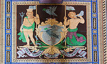 At the rear of the ground floor in Wyatt's extension is the Council Chamber. This has mahogany-panelled walls and can seat 160 people.[9][17] Adjacent to the Council Chamber is the Hall of Remembrance. On its wall are panels bearing the names of the military men who lost their lives in the First World War, and eight murals painted by Frank O. Salisbury in 1923.[9][10]