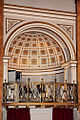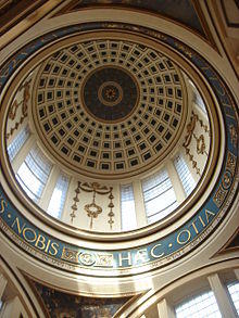 Above the staircase the dome is carried by four pendentives; it rises to a height of 106 feet (32 m) and its interior is coffered. Around the base of the dome is inscribed Liverpool's motto, "Deus Nobis Haec Otia Fecit", and in the pendentives are paintings dated 1902 by Charles Wellington Furse depicting scenes of dock labour.[18][19]