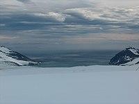 The principal mountain formations on the island comprise Tangra Mountains (32 kilometres or 20 miles long and 8.5 kilometres or 5.3 miles wide, with Mt Friesland rising to 1,700.2 m or 5,578 ft[11][12]), Bowles Ridge (6.5 km or 4 mi long, elevation 822 m or 2,697 ft), Vidin Heights (8 km or 5 mi, 604 m or 1,982 ft), Burdick Ridge (773 m or 2,536 ft), Melnik Ridge (696 m or 2,283 ft) and Pliska Ridge (667 m or 2,188 ft) in the eastern part of the island, and Oryahovo Heights (6 km or 4 mi, 340 m or 1,115 ft), and Dospey Heights (6 km or 4 mi, 265 m or 869 ft).[3] The local ice relief is prone to change; in December 2016 the elevations of Mount Friesland and St. Boris Peak were 1,693 m (5,554 ft) and 1,699 m (5,574 ft) respectively, making the latter the summit of Livingston in that season.[13] According to the American high accuracy Reference Elevation Model of Antarctica (REMA), Mount Friesland is 8 m (26 ft) higher than St. Boris Peak.[14]