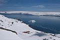 Livingston is separated from neighbouring Greenwich Island to the east by the 3.3 km (2.1 mi) wide McFarlane Strait, and from Snow Island to the west-southwest by the 5.9 km (3.7 mi) wide Morton Strait. Deception Island, situated in Bransfield Strait barely 18 km (11.2 mi) southwest of Livingston's Barnard Point, is an active volcano last erupting in 1967, 1969 and 1970[4] whose flooded caldera forms the 9.8 km (6 mi) by 6.8 km (4 mi) sheltered harbour of Port Foster entered by a single 540 metres (590 yards) wide passage known as Neptune's Bellows. There are several extinct volcanoes on Livingston Island itself that were active in the Quaternary, such as Rezen Knoll, Gleaner Heights, Edinburgh Hill and Inott Point.[5]