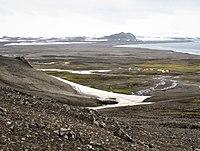Typical of the island's glaciology are the conspicuous ash layers originating from volcanic activity on neighbouring Deception Island.[8] The island hosts also several rock glaciers consisting of rock debris frozen in ice, such as those at Nusha Hill, MacKay Peak and Renier Point.[9]