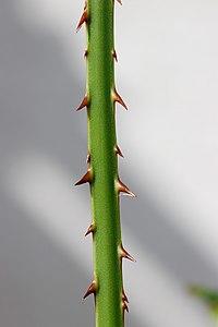Spines on margins of the petiole of a young plant of Saribus rotundifolius