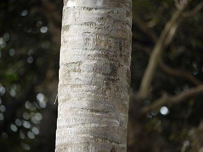 Saribus rotundifolius is a hermaphrodite fan palm.[2] The palm is evergreen, erect, and only grows having a single trunk ('solitary'). It grows at a height ranging from 15 to 25 metres,[11] exceptionally up to 45 metres tall,[2] and thickness of 15 to 25 cm diameter at breast height.[2][11] Its trunk is smooth and straight with a shallow rings of leaf scars.[11] The trunk is rather massive and tapering. It usually grows to 60 feet (18 m) tall, but may rarely reach 90 feet (27 m) tall. The young trees have a green crown. This species is seldom seen with a slight skirt of drooping, dead leaves. The sheaths are chestnut brown in colour.[9]