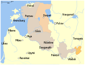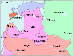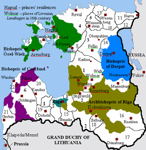 By the mid-16th century, economically prosperous Old Livonia[2] had become a region organised into the decentralised and religiously divided Livonian Confederation.[3] Its territories consisted of the Livonian branch of the Teutonic Order, the prince-bishoprics of Dorpat (Tartu), Ösel–Wiek, as well as Courland, the Archbishopric of Riga and the city of Riga.[2][4] Together with Riga, the cities of Dorpat (Tartu) and Reval (Tallinn), along with the knightly estates, enjoyed privileges enabling them to act almost independently.[4] The only common institutions of the Livonian estates were the regularly held common assemblies known as landtags.[2] As well as a divided political administration, there were also persistent rivalries between the archbishop of Riga and the landmeister of the Order for hegemony.[nb 1][2][4] A schism had existed within the Order since the Reformation had spread to Livonia in the 1520s, although the transformation of the country into a Lutheran region was a gradual process, resisted by part of the Order that to a varying degree remained sympathetic to Roman Catholicism.[5] As war approached, Livonia had a weak administration subject to internal rivalries, lacked any powerful defences or outside support, and was surrounded by monarchies pursuing expansionist policies. Robert I. Frost notes of the volatile region: "Racked with internal bickering and threatened by the political machinations of its neighbours, Livonia was in no state to resist an attack."[6]