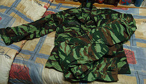 Horizontal lizard patterns in different colour forms were made by the French. A copy of the French pattern, made in Asia, was adopted by some African countries such as Chad, Gabon, Rwanda, and Sudan. In around 1970 Cuba designed a gray variety, used by Cuba and by the FAPLA of Angola. Greece has used a range of horizontal lizard patterns from the 1960s. Russian Spetsnaz and interior ministry troops wear horizontal lizard patterns.[2] The Israel Defence Force used actual French lizard uniforms (donated by France) until 1968, alongside plain (unpatterned) battledress.[5] French lizard was among the patterns used in Congo in 1978.[6] After the Algerian War the "Troupes Aéroportée" (Airborne Troops) "Tenue Leopard"/"tenues de saut" was officially withdrawn from French service in January 1963 as it was felt to be a reminder of the Paratroops mutiny. It was initially replaced with the olive green M1947 "trellis/tenue de compagne" and later the newer green "trellis Satin M1964" in 1971 which became the "tenue F-1", the forest camouflage CCE was introduced in 1991.[7]