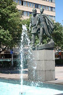 The first known inhabitant of the area that is today's Ljungby was Astrad, as can be read on the runestone Replösastenen from the 11th century located a couple of kilometers from the city center. The runestone says: "Götrad made this stone after Astrad, the foremost of kinsmen and yeomen (Swedish:odalmän) who in Finnveden formerly lived". In 1952 a statue by John Lundqvist was erected near the main plaza depicting Astrad and Götrad. But there were other people living around Ljungby long before Astrad and Götrad as evident by the numerous burial mounds in the area. One of the largest burial mounds lies close to the water tower and is named Kungshögen. The largest burial is however Höga rör that lies some kilometers south of Ljungby on the slope of the Lagan river valley.
