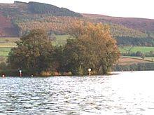 The crannog is a small artificial island about 40 metres (130 ft) from the north shore. It is constructed of massive planks of oak behind which was built a dwelling platform formed from layers of stone, soil and brushwood.[7] It was investigated by archaeologists from the National Museum of Wales between 1989 and 1993. Finds included a high quality textile and a bronze hinge from an 8th–9th century reliquary decorated in a style similar to that seen in Ireland.[8] The 1993 dig was joined by the TV series Time Team and featured in series one, episode four in 1994.[9] In 2005, works were carried out to protect the island from erosion.[8]