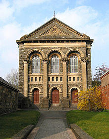 - Trinity United Reformed Church, Shortbridge Street, formerly Sion Independent Chapel. Built in 1878 by John Humphreys of Swansea, a notable chapel builder. Set back within its plot to great effect. The three-bay façade has giant classical columns carrying arcading, with a pediment above. Rock-faced masonry with a smooth ashlar band over the trio of doorways containing plain lights for the lobby. Tall windows above with Florentine wooden tracery. The varnished pine interior contains raked seating. The gallery, continuous round all four sides, has a band of cast iron foliagework over boarding, with an organ above the pulpit. Pulpit with arcaded front. It cost £1,550 to build.[11]