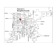 The LoDo neighborhood, near Denver's Union Station,[4] highlighted on this map of Denver neighborhoods.