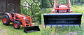 While the front-end loaders on CUT size tractors are capable of many tasks, given their relatively small size and low capacities when compared to commercial loaders, the compact loaders can be made more useful with some simple options. A toothbar is commonly added to the front edge of a loader bucket to aid with digging. Some loaders are equipped with a quick coupler, otherwise known as a quick attach (QA) system. The QA system allows the bucket to be removed easily and other tools to be added in its place. Common additions include a set of pallet forks for lifting pallets of goods or a bale spear for lifting hay bales.