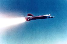 The D-21 was first launched from an M-21 on 5 March 1966.[8] The drone was released but stayed close to the M-21's back for a few seconds, which seemed like "two hours" to the M-21 crew.[9] A second launch took place on 27 April 1966; the D-21 reached its operational altitude of 90,000 ft (27,000 m) and speed of over Mach 3.3 (2,200 mph; 3,600 km/h), though it was lost due to a hydraulic pump failure after a flight of over 1,200 nmi (1,400 mi; 2,200 km). The USAF's interest in the program continued and more D-21s were ordered after the second launch.[8] A third flight took place on 16 June with the D-21 flying 1,550 nmi (1,800 mi; 2,900 km) through its complete flight profile, though its camera hatch was not released due to an electronics failure.[10]