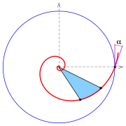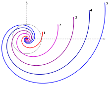- Example: The diagram shows spirals with slope angle and . Hence they are all scaled copies of the red one. But they can also be generated by rotating the red one by angles resp.. All spirals have no points in common (see property on complex exponential function).