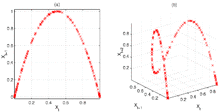The following figure illustrates the stretching and folding over a sequence of iterates of the map. Figure (a), left, shows a two-dimensional Poincaré plot of the logistic map's state space for r = 4, and clearly shows the quadratic curve of the difference equation (1). However, we can embed the same sequence in a three-dimensional state space, in order to investigate the deeper structure of the map. Figure (b), right, demonstrates this, showing how initially nearby points begin to diverge, particularly in those regions of xt corresponding to the steeper sections of the plot.