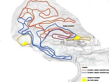 - Trail layout and length – The trail system should comprise loops with internal connectors and cutoffs that allow the skier discretion in how long to ski. Loop lengths should range from 5 to 15 km with a beginners loop of about 1 km. Minimum clearing widths should range between 3 and 5 meters, depending on what type of skiing is accommodated and whether a steep section would require herringbone technique uphill or turns downhill. Grades should usually be less than 5% rise over run for general skiing with occasional sustained pitches of 10% and short (less-than-50-m) pitches of up to 25%.[11]