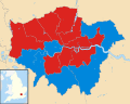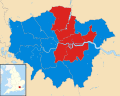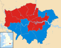 The Assembly comprises 25 Assembly Members elected using the Additional Member System of proportional representation, with 13 seats needed for a majority. Elections take place every four years – at the same time as for the Mayor. There are 14 geographical super-constituencies each electing one Member, with a further 11 members elected from a party list to make the total Assembly Members from each party proportional to the votes cast for that party across the whole of London using a modified D'Hondt allocation.[2] A party must win at least 5% of the party list vote in order to win any seats. Members of the London Assembly have the post-nominal title 'AM'. The annual salary for a London Assembly Member is approximately £59,000.[3]
