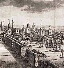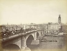 Until the mid-eighteenth century the Old London Bridge was the only crossing on the Thames in London. It was damaged in a major fire in 1633, but in the fire of 1666 this damage acted as a fire break and prevented the flames from further damaging the bridge and crossing to the south side of the Thames. With its 19 narrow arches, it impeded river traffic and flow. Central piers were removed to create a wider navigational span. Widening and the removal of its houses was completed in 1763, but it remained relatively narrow and needed continual and expensive repairs. In the early nineteenth century it was decided to replace the bridge with a new construction. New London Bridge was opened in 1831 and survived until it was replaced in 1972. It was then transported and reconstructed in Lake Havasu City, Arizona.[14]