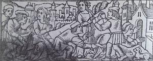 - Eleanor of Provence (c. 1223–91), consort of Henry III who had custody of the bridge revenues from 1269 to about 1281.[11] Eleanor of Provence was also attacked with eggs and stones at London bridge by the discontented citizens as her barge tried passing beneath the bridge. This was in response to the political discontent that had been created not only by King Henry III's vast unpopularity at the time but was also sparked by his son King Edward I's raiding of the Temple.[15]