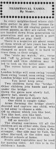 The rhyme is often used in a children's singing game, which exists in a wide variety of forms, with additional verses. Most versions are similar to the actions used in the rhyme "Oranges and Lemons". The most common is that two players hold hands and make an arch with their arms while the others pass through in single file. The "arch" is then lowered at the song's end to "catch" a player. In the United States, it is common for two teams of those that have been caught to engage in a tug of war.[2] In England until the nineteenth century the song may have been accompanied by a circle dance, but arch games are known to have been common across late medieval Europe.[1]
